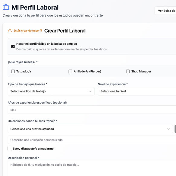 ¿Estás buscando trabajo como tatuador/a, piercer o tattoo shop manager? Crea un perfil en menos de 2 minutos y regístrate a la bolsa de empleo para que puedan ver y contactarte estudios de tatuajes.