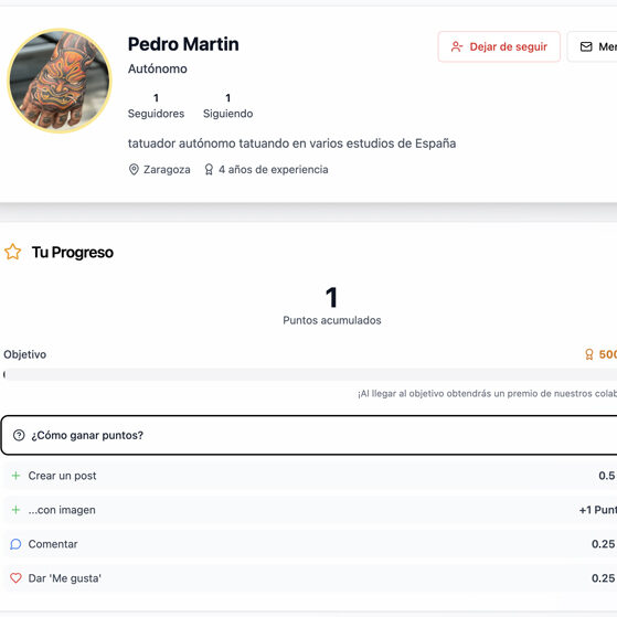 Cuanto más interactúes en la Comunidad, más puntos irás logrando… Cuando llegues a los 500 acumulados, tendrás un regalo asegurado: agujas, tintas, máquinas… de alguna tattoo supplier.