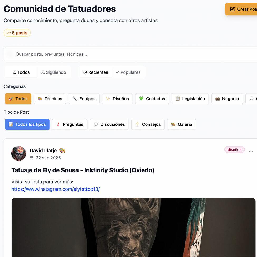 Resumiendo, es una mezcla entre Instagram y Facebook, pero centrado 100% en el mundo del tattoo, válido para tatuadores profesionales, estudios de tatuajes y aprendices a tatuador/a.